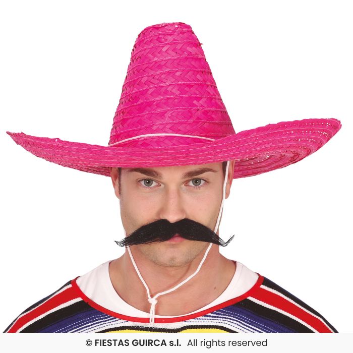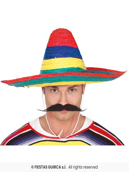 Homem a usar chapéu mexicano colorido e bigode postiço preto