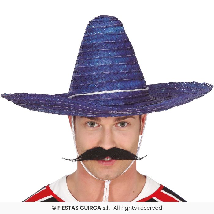 Homem a usar chapéu tipo sombrero azul e bigode falso preto