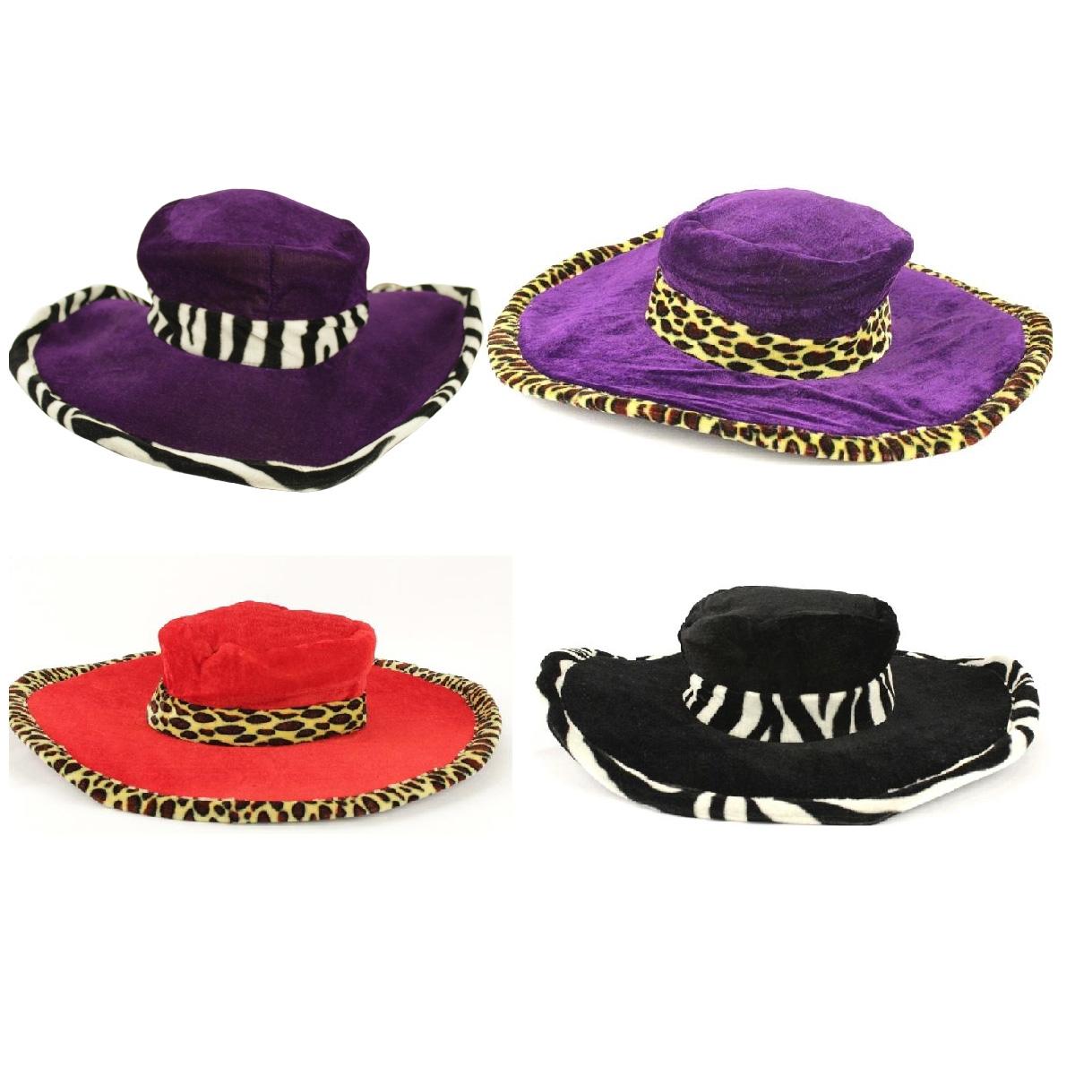 Quatro chapéus largos de abas com padrões animais em várias cores.