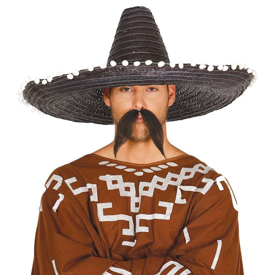 Homem com chapéu mexicano preto e bigode falso vestido com traje castanho e padrões brancos