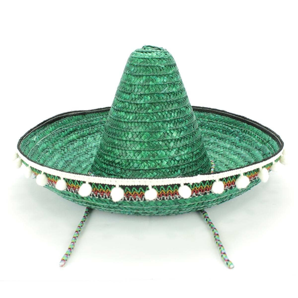 Chapéu mexicano verde em palha com pompons brancos