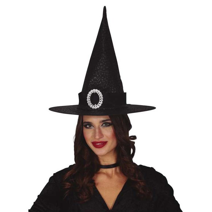 Chapéu de bruxa preto pontudo com fivela prateada