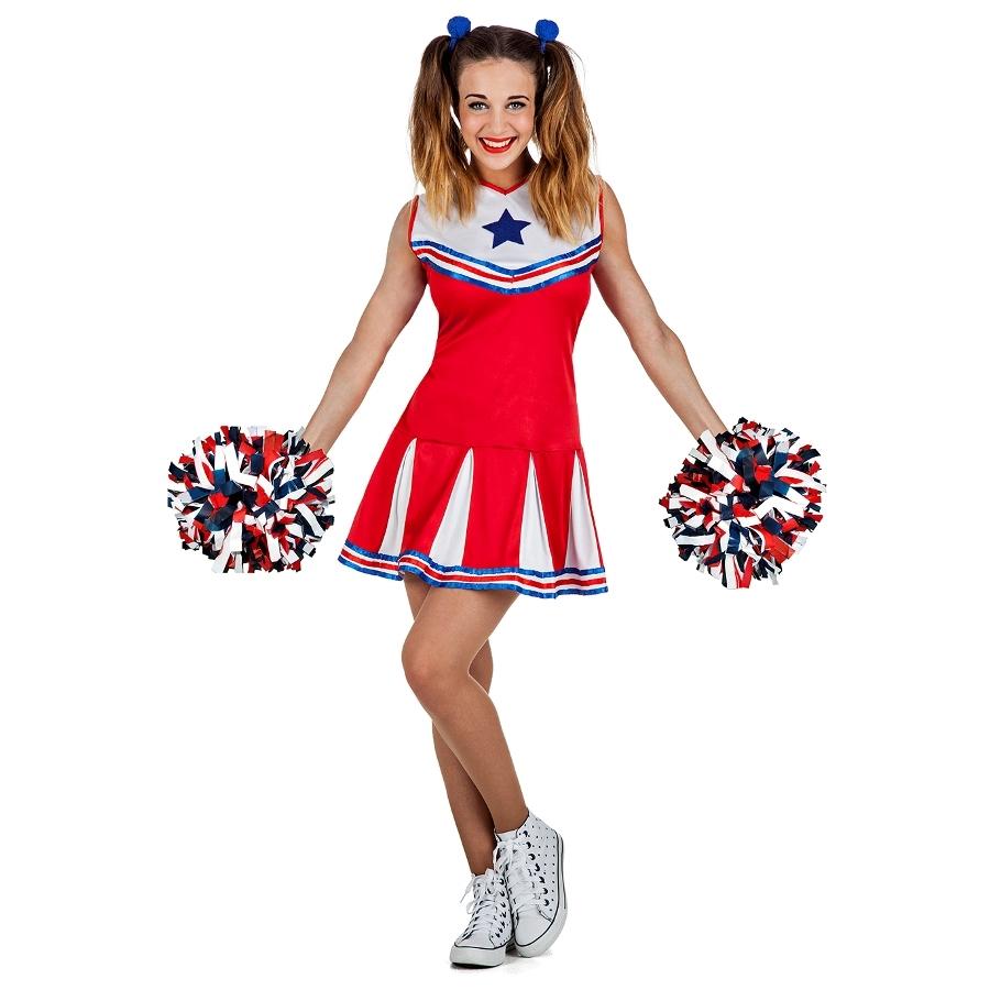 Fantasia de animadora de apoio vermelha, branca e azul com pompons