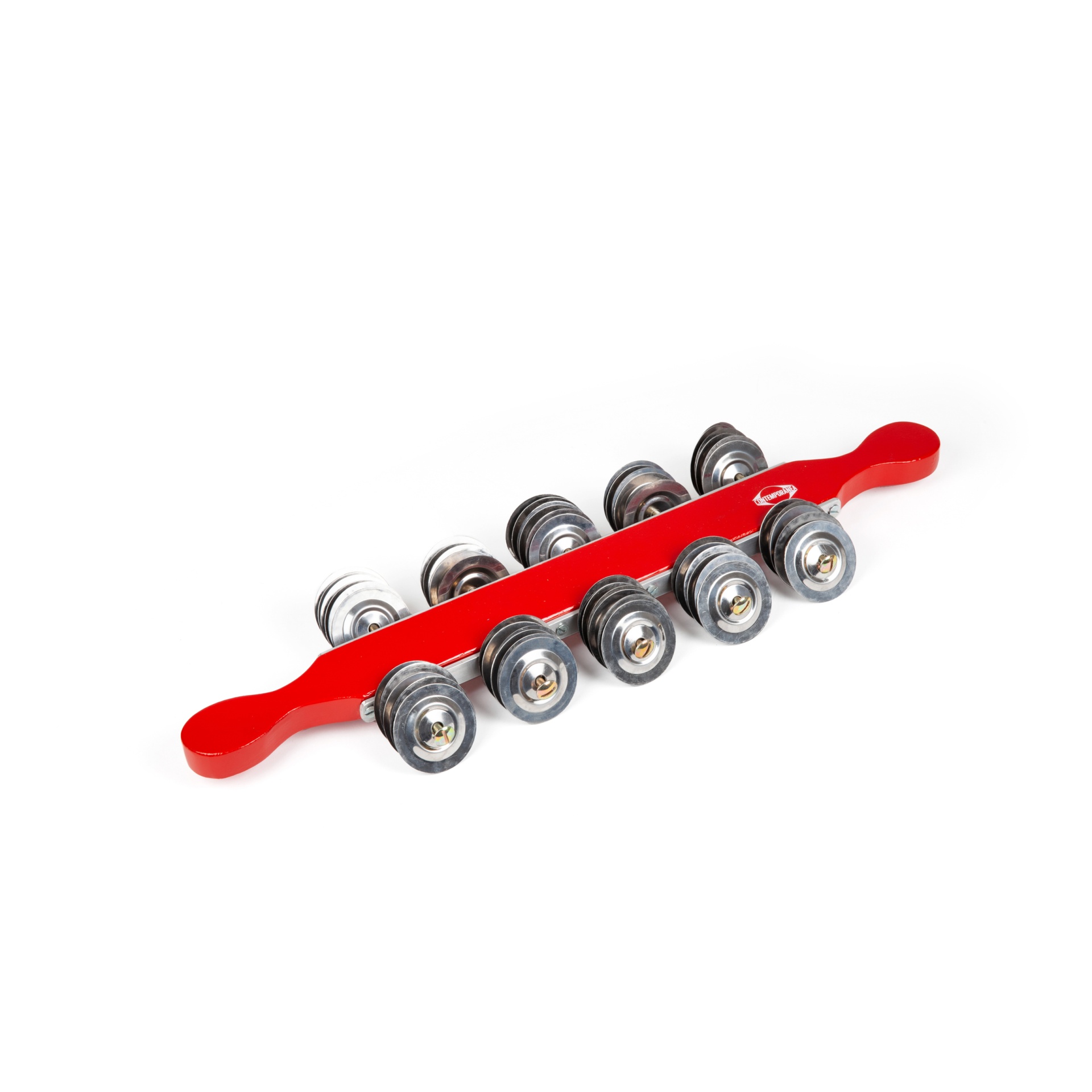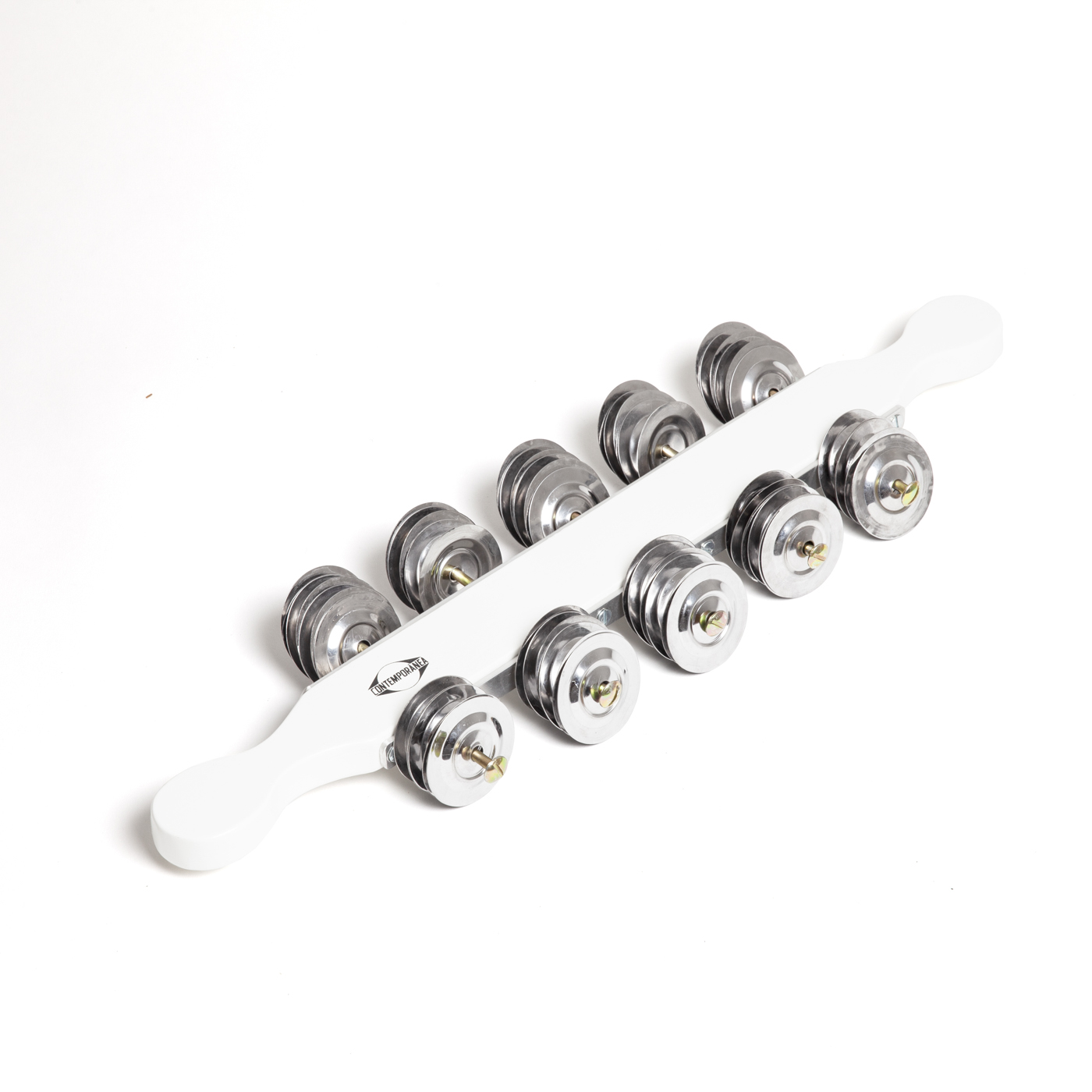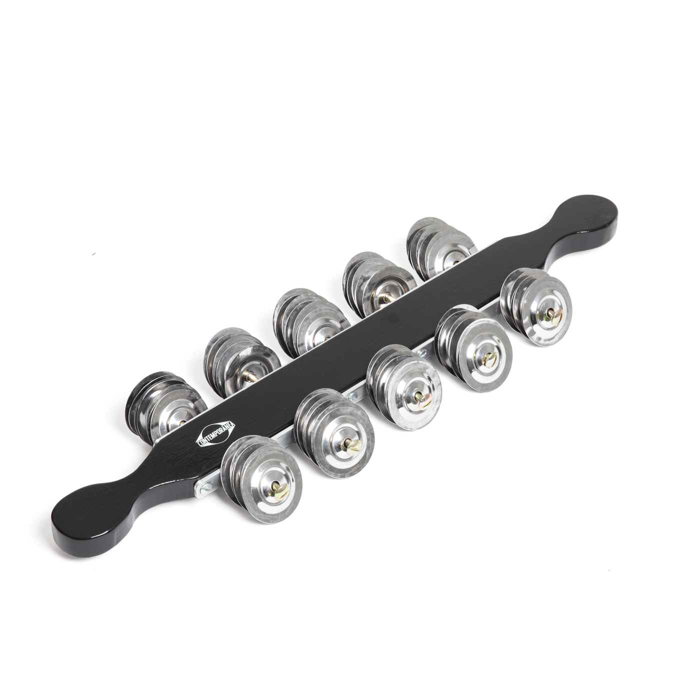 Instrumento musical de madeira com dez castanholas de metal prateado