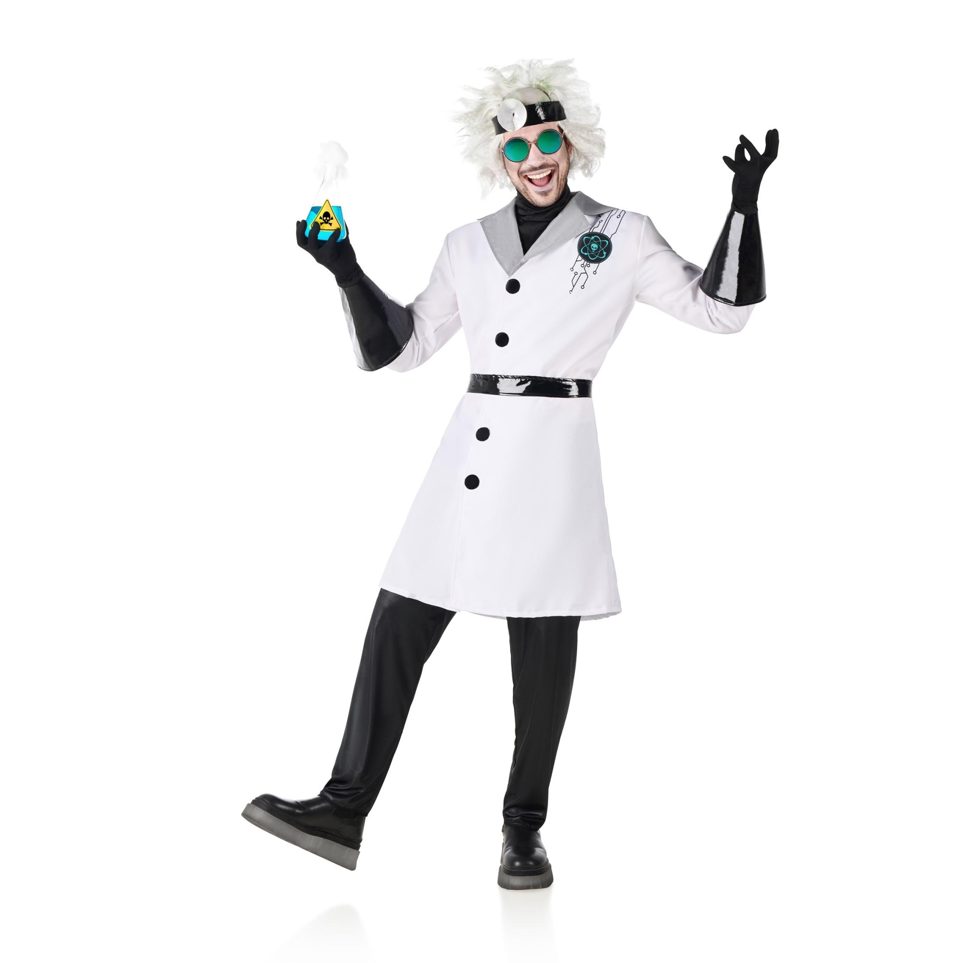 Fato de cientista louco branco com acessórios pretos e peruca branca