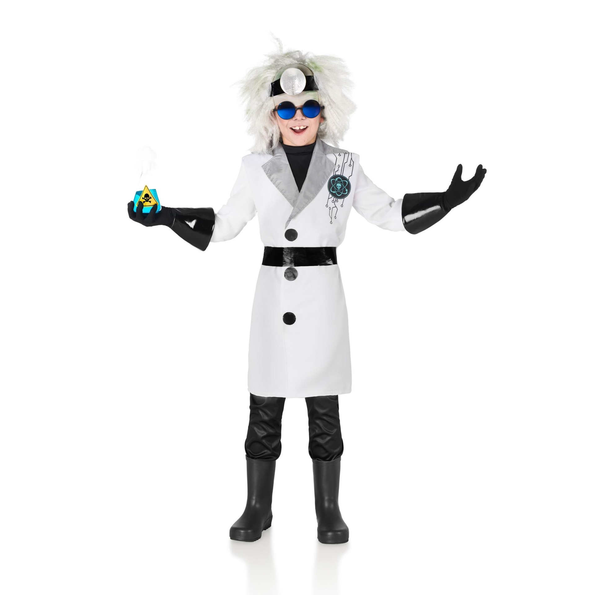 Pessoa com traje de cientista maluco preto e branco segurando objeto azul