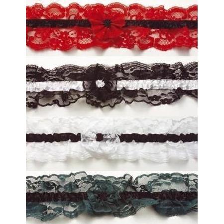 Quatro ligas de renda em vermelho, preto, branco e verde escuro com faixas e flores de renda