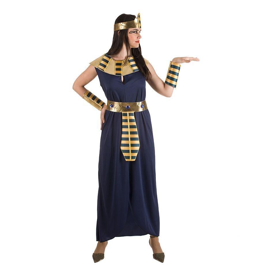Fato egípcio azul com acessórios dourados e pretos em padrão listrado