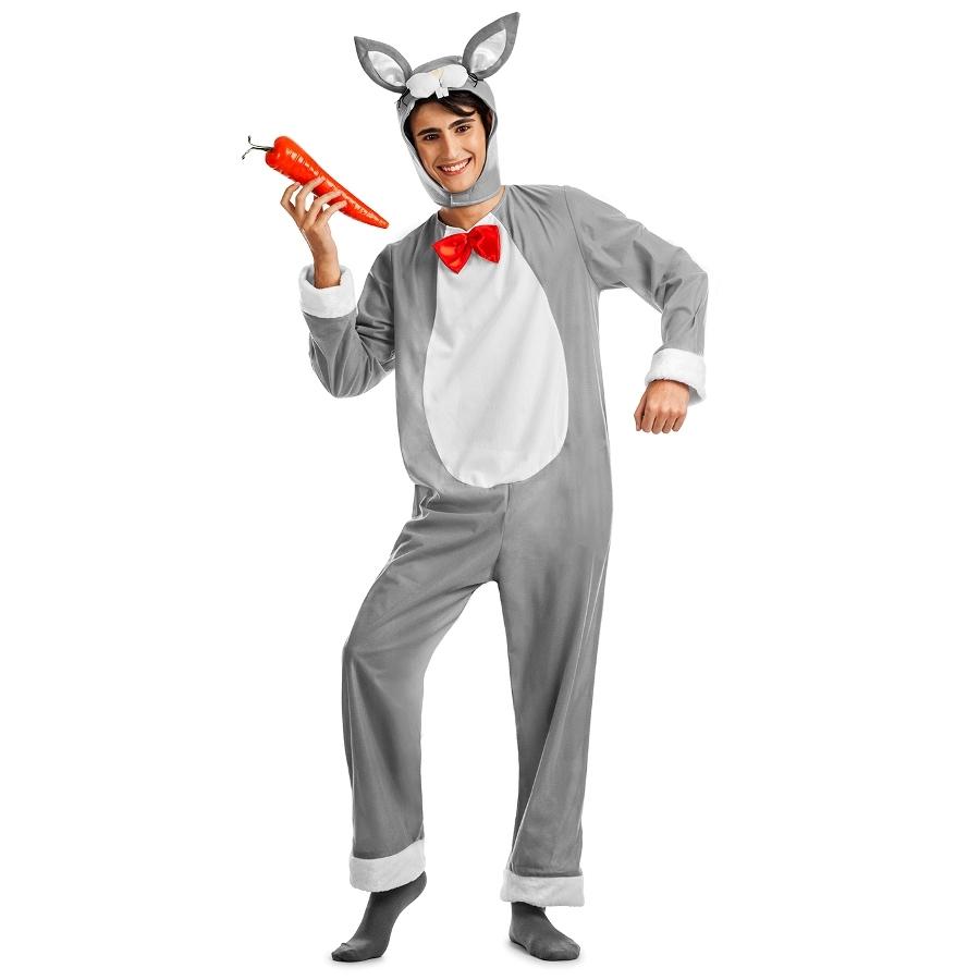 Fantasia de coelho cinzenta e branca com capuz e laço vermelho