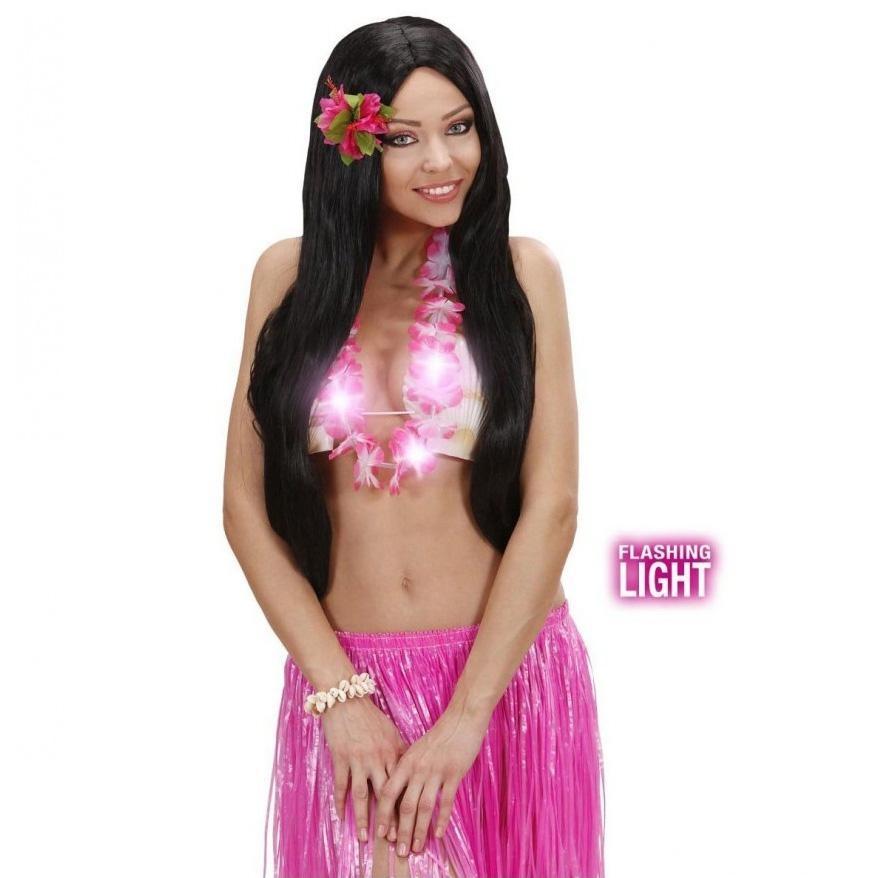 Mulher com saia de franjas rosa e colar de flores com luzes