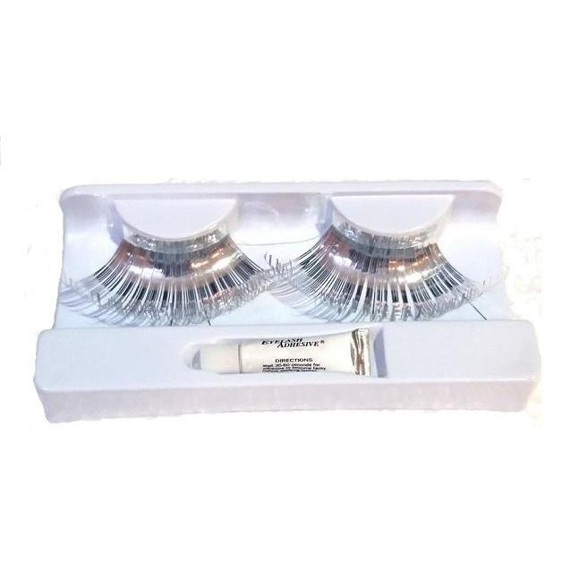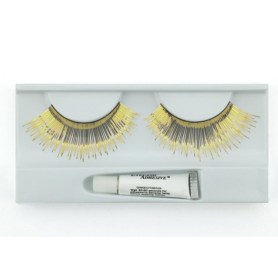 Pestanas postiças pretas e douradas com cola num estojo branco