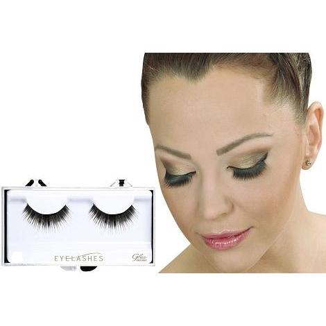 Pestanas falsas pretas e rosto de mulher com maquilhagem dourada