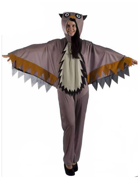 Fato de coruja castanho com capuz e padrão de penas nas mangas e peito
