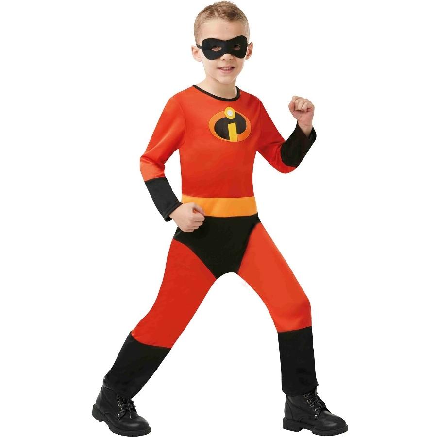 Fato de super-herói vermelho e preto para criança com máscara preta.