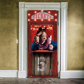 Porta vermelha com letreiro TICKETS e figura de palhaço assustador segurando faca