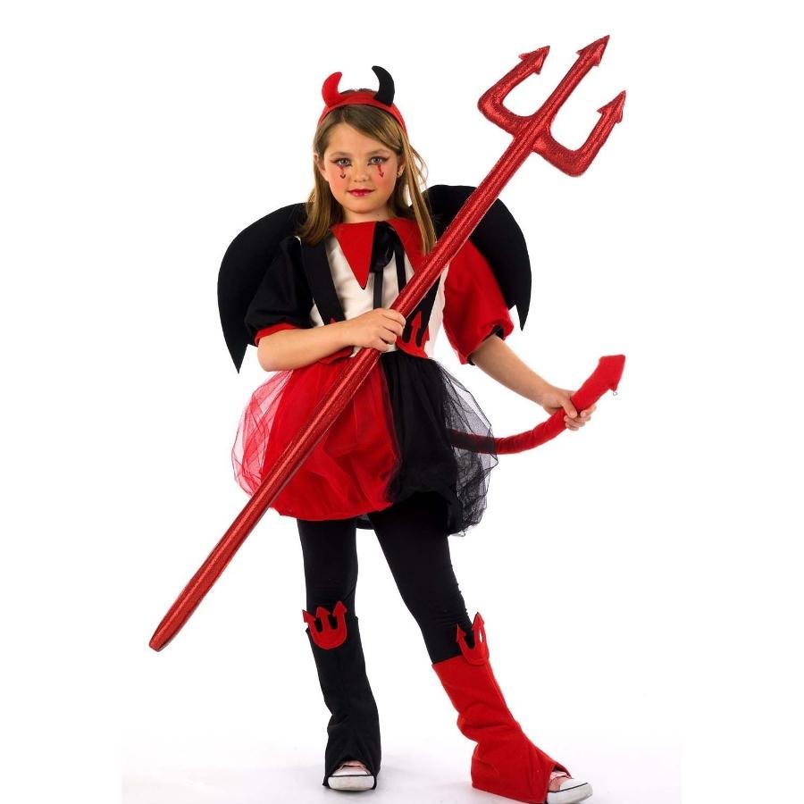 Criança em fantasia de diabo com acessórios em fundo branco