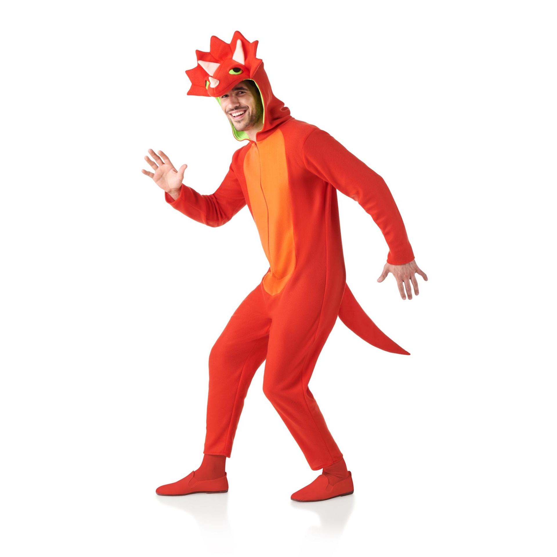 Fato de dinossauro vermelho e laranja com capuz e cauda