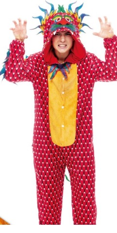 Pessoa com fato vermelho de dragão com capuz colorido e painel amarelo