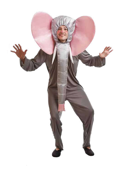 Pessoa com fantasia integral de elefante cinza e rosa