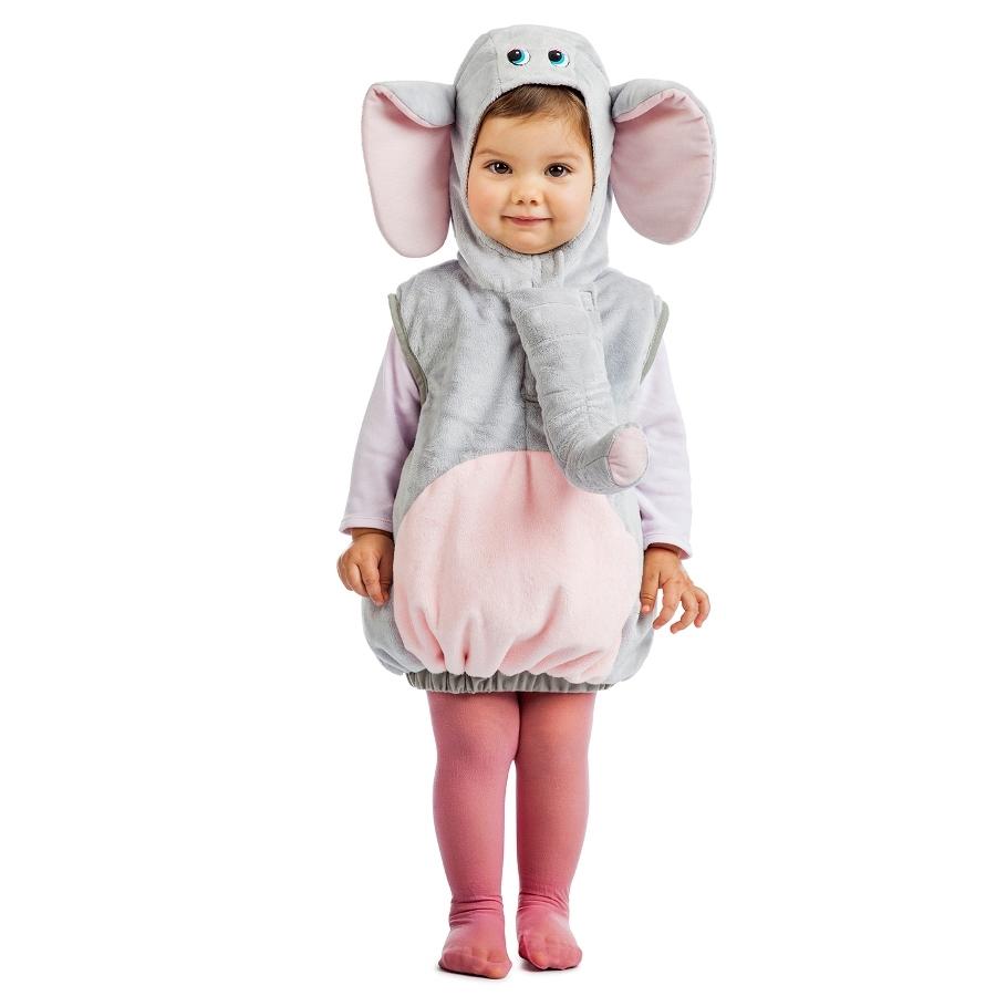 Criança com fantasia de elefante cinzento e rosa, com nariz e orelhas grandes.