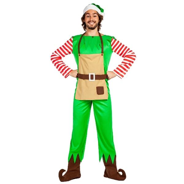 Fato de duende verde com avental bege e mangas às riscas vermelhas e brancas