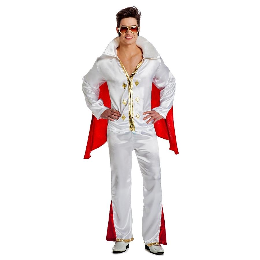 Fato branco acetinado com capa vermelha, detalhes dourados e óculos de sol