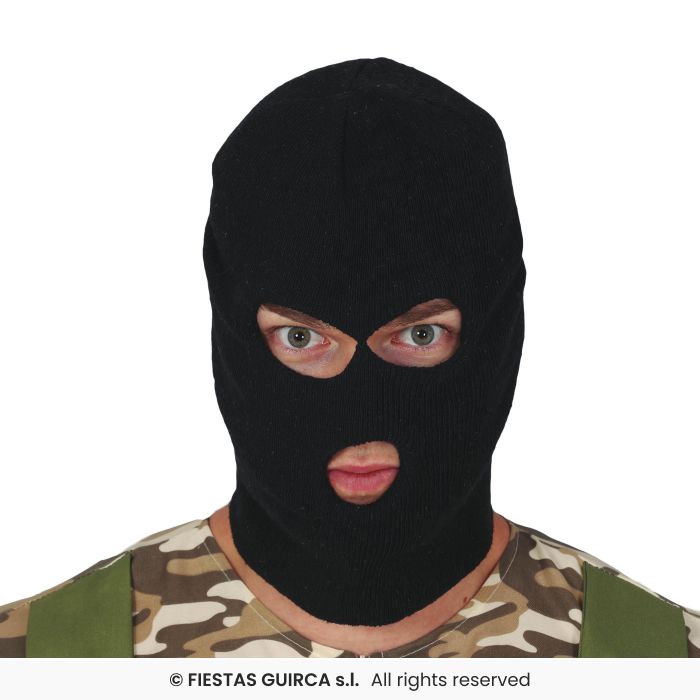 Máscara balaclava preta com três aberturas para olhos e boca