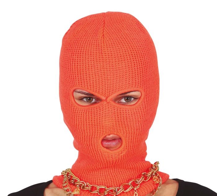 Pessoa com balaclava laranja de malha com três aberturas e colar dourado