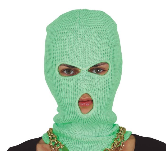 Balaclava verde neón com aberturas para olhos e boca e colar dourado.