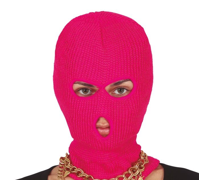 Pessoa a usar capuz de malha rosa com aberturas para olhos e boca