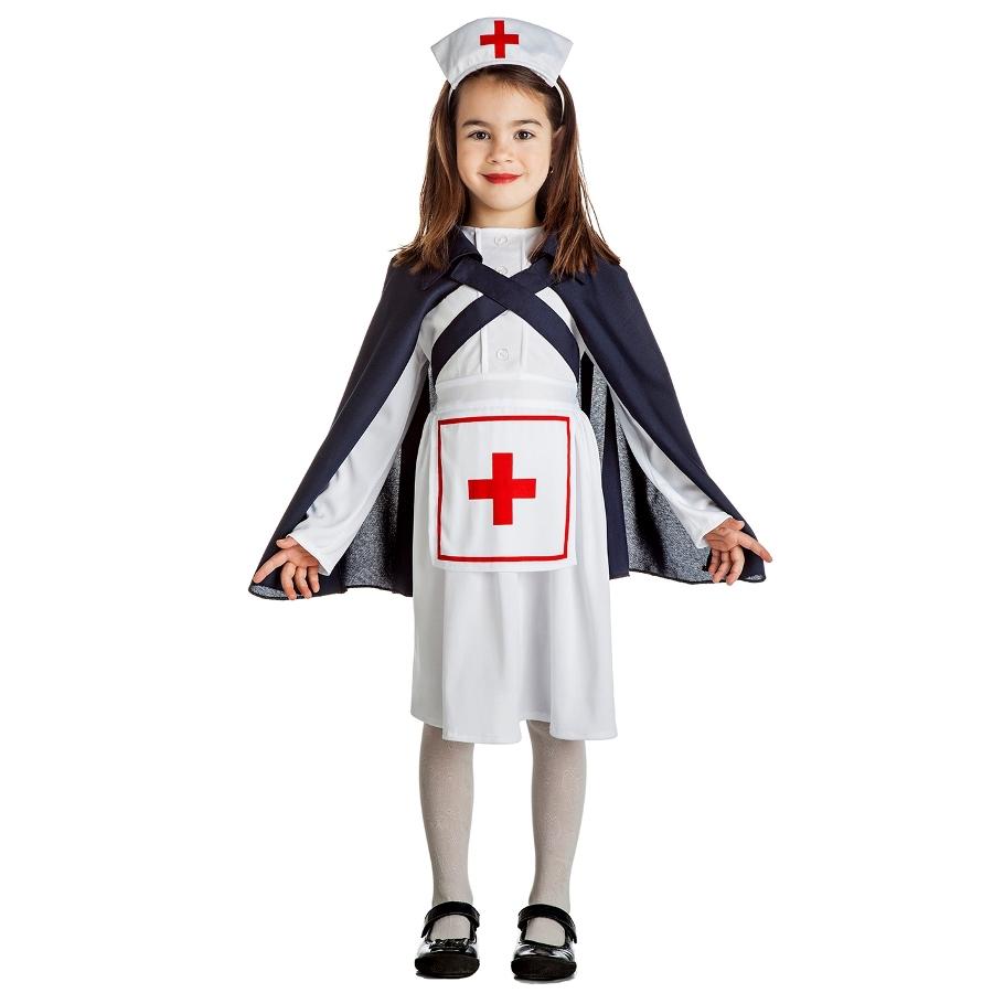 Criança vestida de enfermeira com vestido branco, capa preta e touca com cruz vermelha