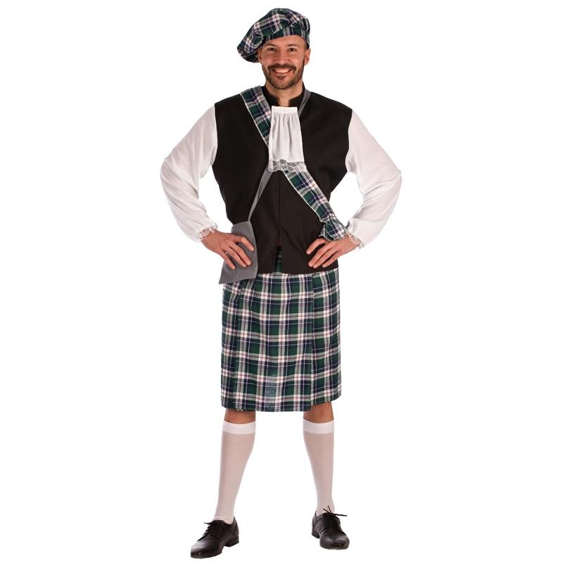Homem com traje tradicional escocês em padrão tartan verde e azul