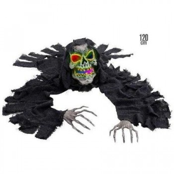 Decoração de caveira com capa preta esfarrapada e mãos cinzentas