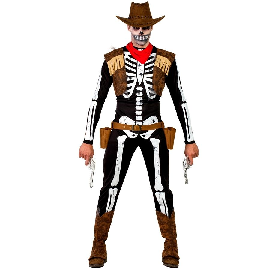 Fato de cowboy esqueleto para Halloween com chapéu castanho e pistolas.