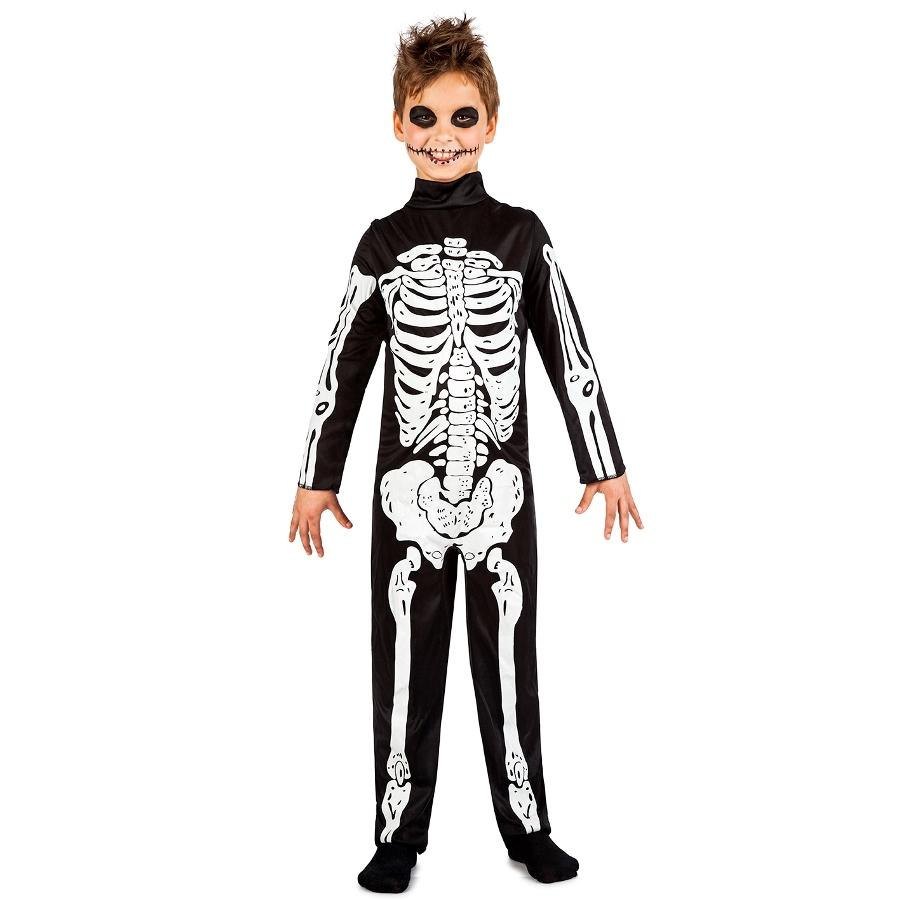 Fato de esqueleto preto com ossos brancos e maquilhagem de caveira