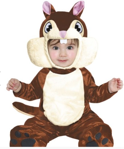 Fato de fantasia para bebé de esquilo, castanho e bege, capuz com rosto e orelhas.