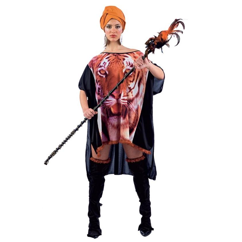 Vestido túnica com estampa de tigre, botas pretas e touca laranja, modelo segurando bastão decorativo
