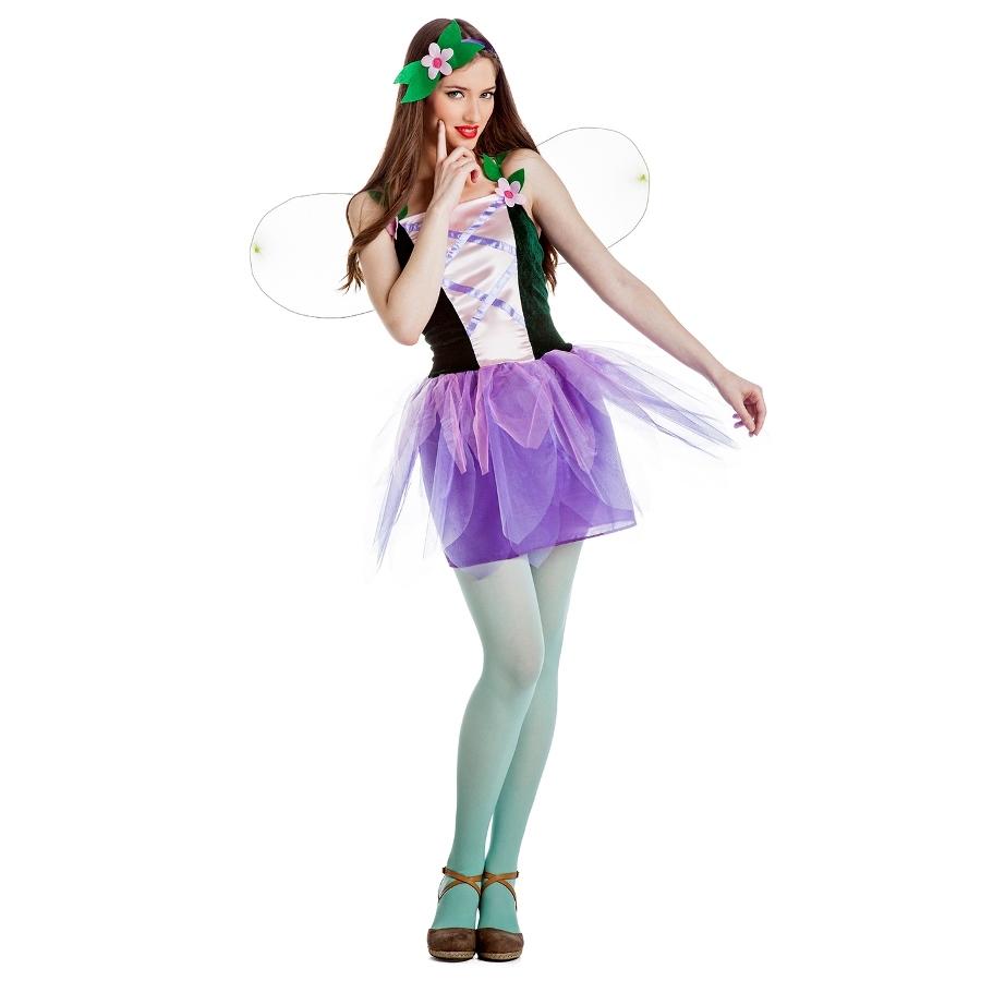 Fantasia de fada com saia de tule roxa e asas transparentes