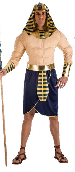 Fato de faraó egípcio com máscara dourada e preta, túnica azul com detalhes dourados e cinto dourado