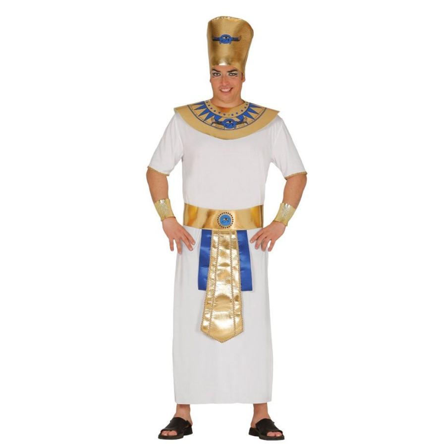 Fato egípcio com túnica branca, acessórios dourados e azuis