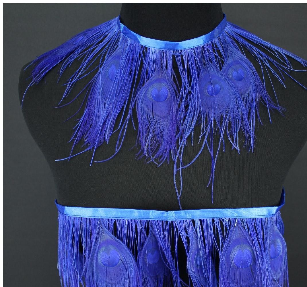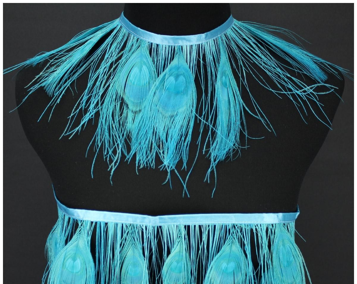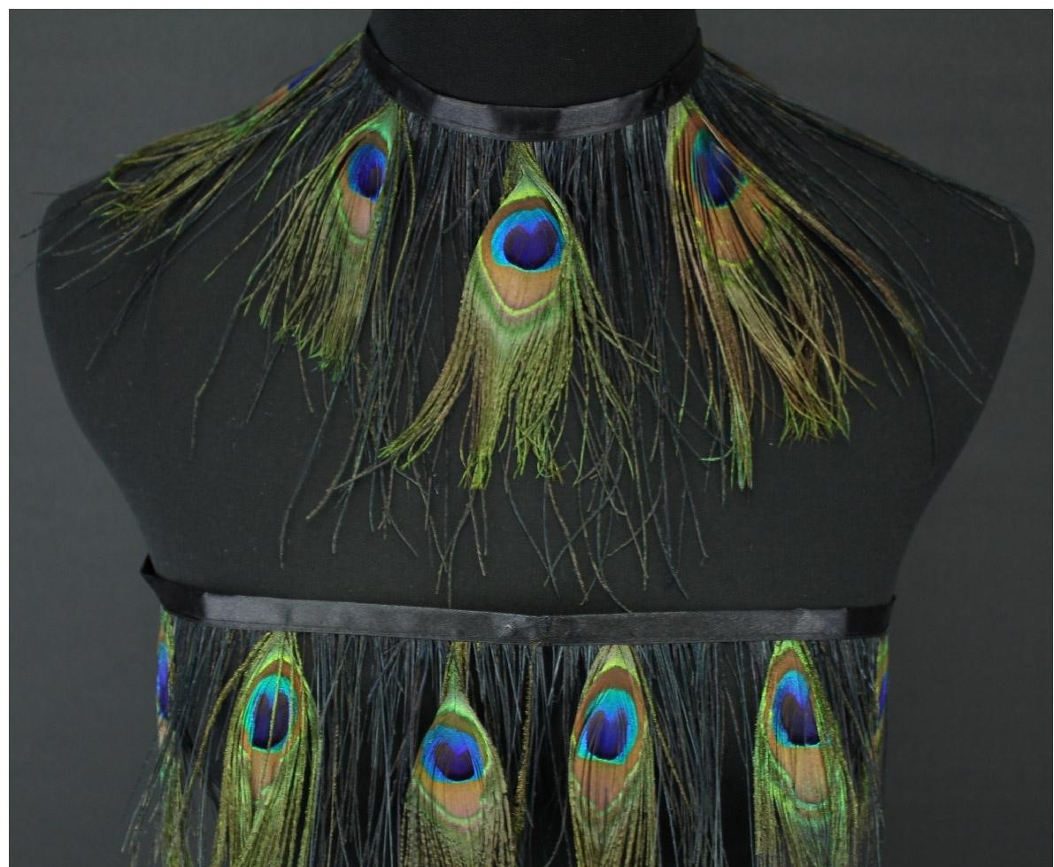 Conjunto de penas de pavão montadas em fitas pretas num manequim.