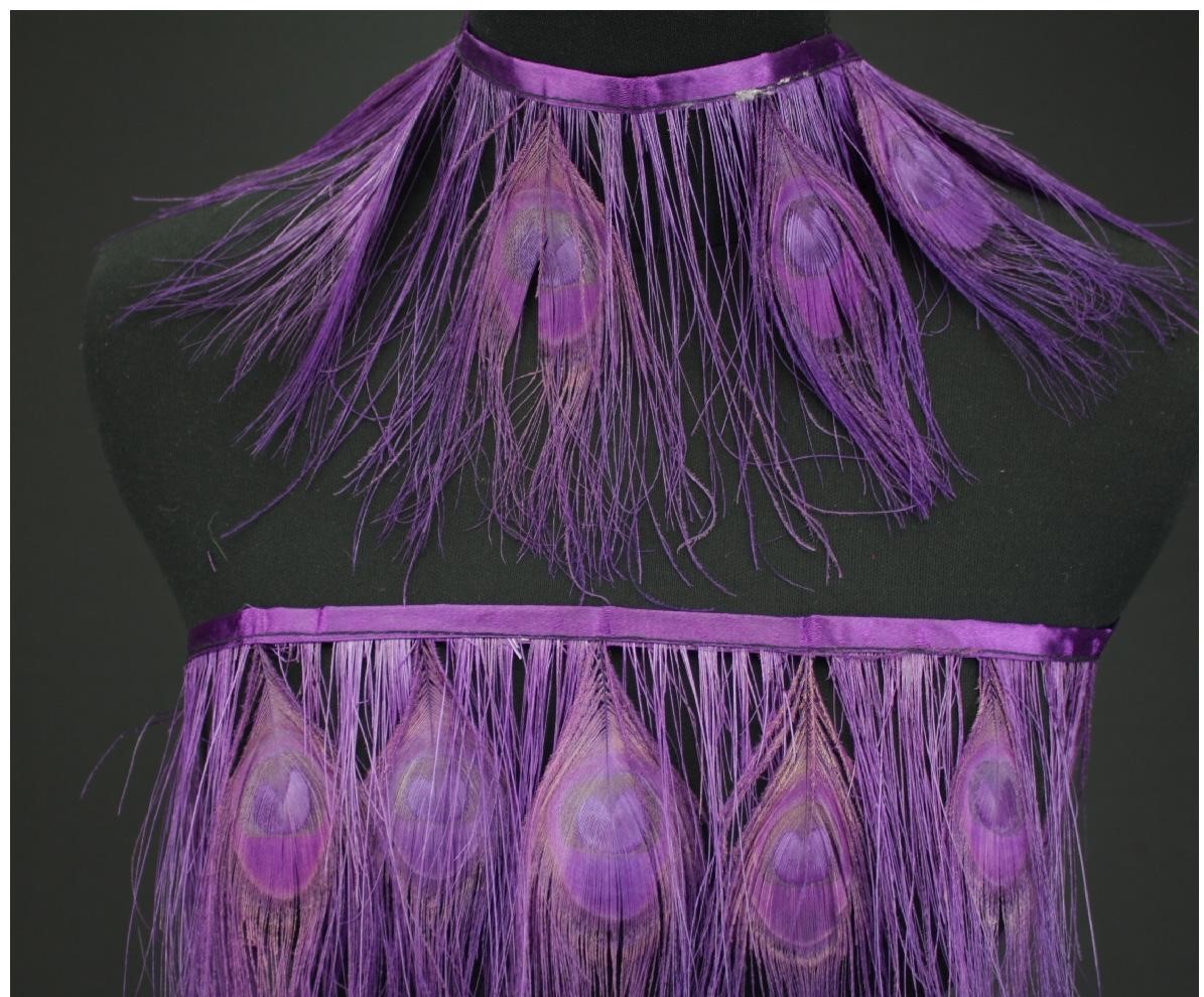 Franja decorativa roxa com penas longas e padrão de olho de pavão