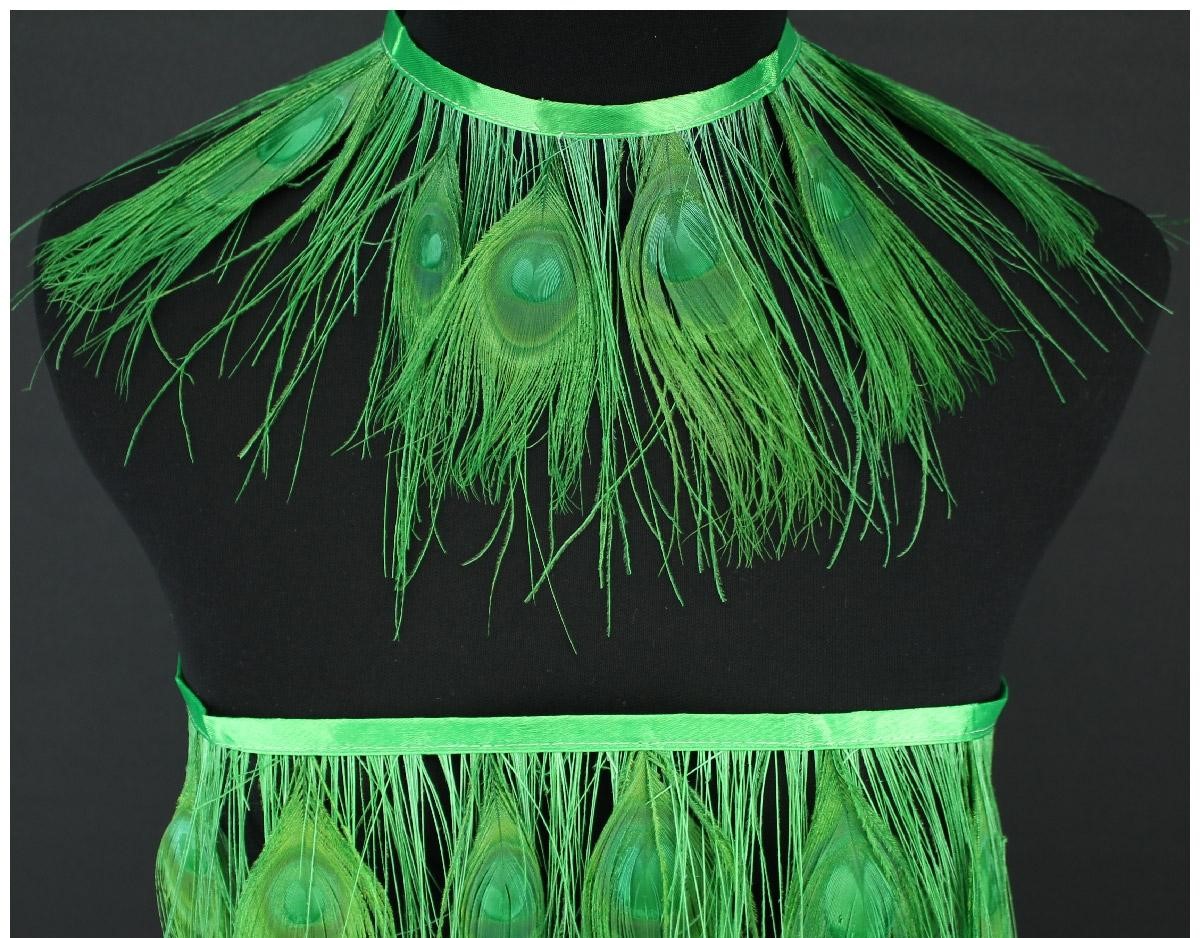 Conjunto de acessórios com penas de pavão verdes em tecido verde com franjas longas