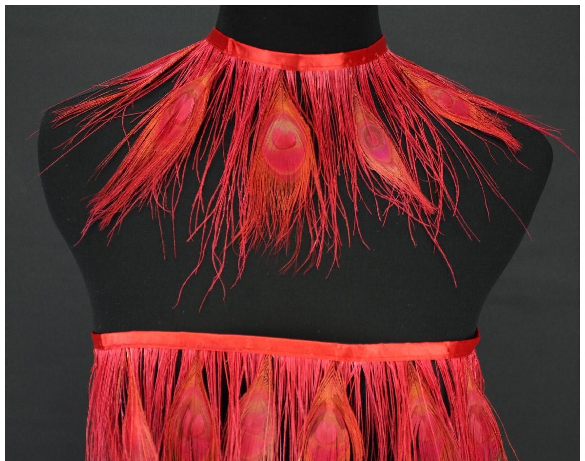Conjunto de adereços vermelhos de penas com detalhes de pavão num manequim preto