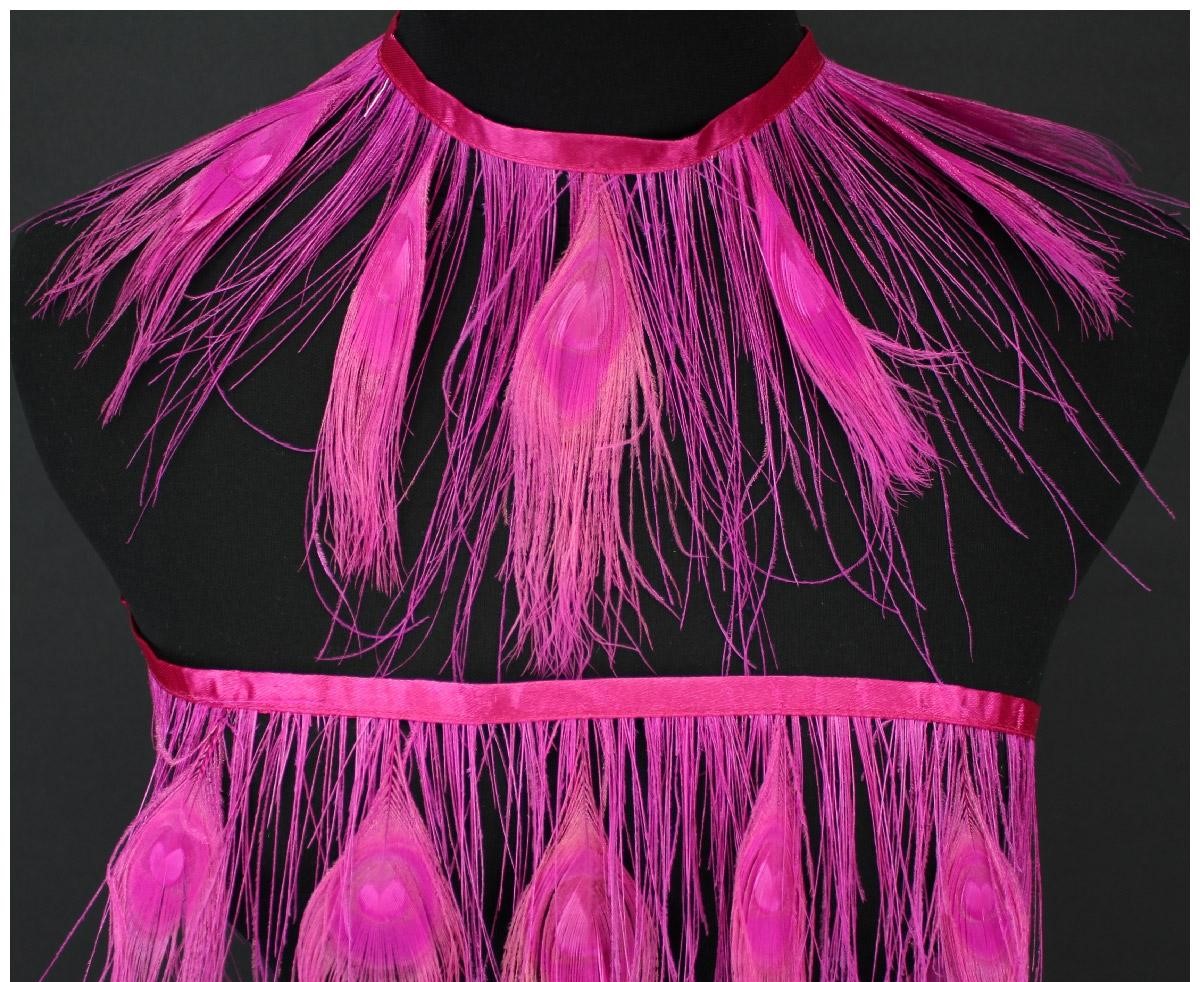 Colar e cinto decorativos com penas rosa sobre manequim preto