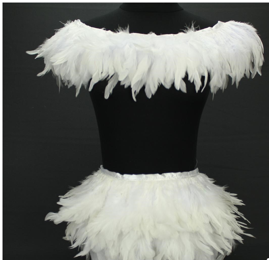 Conjunto feminino penas brancas sobre manequim preto