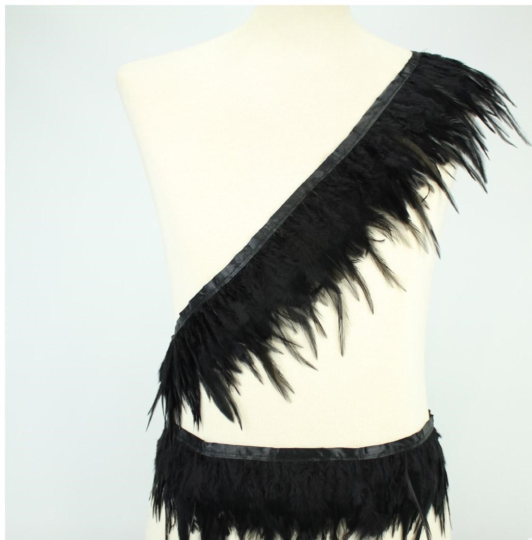 Fita preta com penas e bordas de cetim num manequim branco