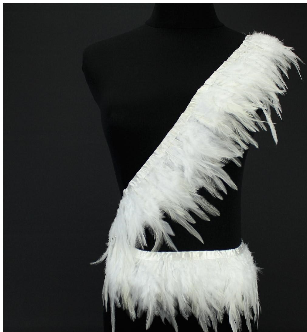 Faixa e cinto de penas brancas em manequim preto