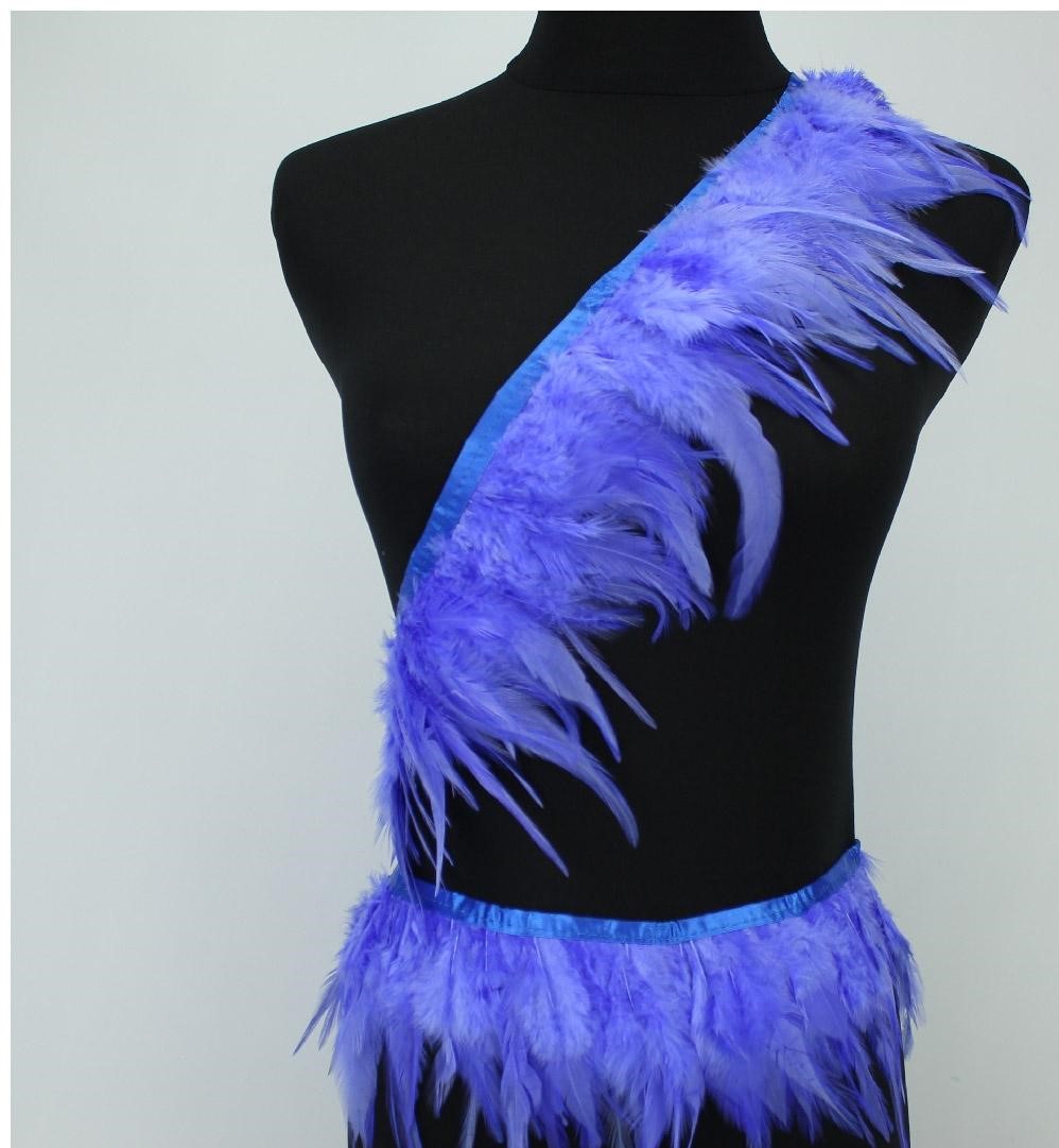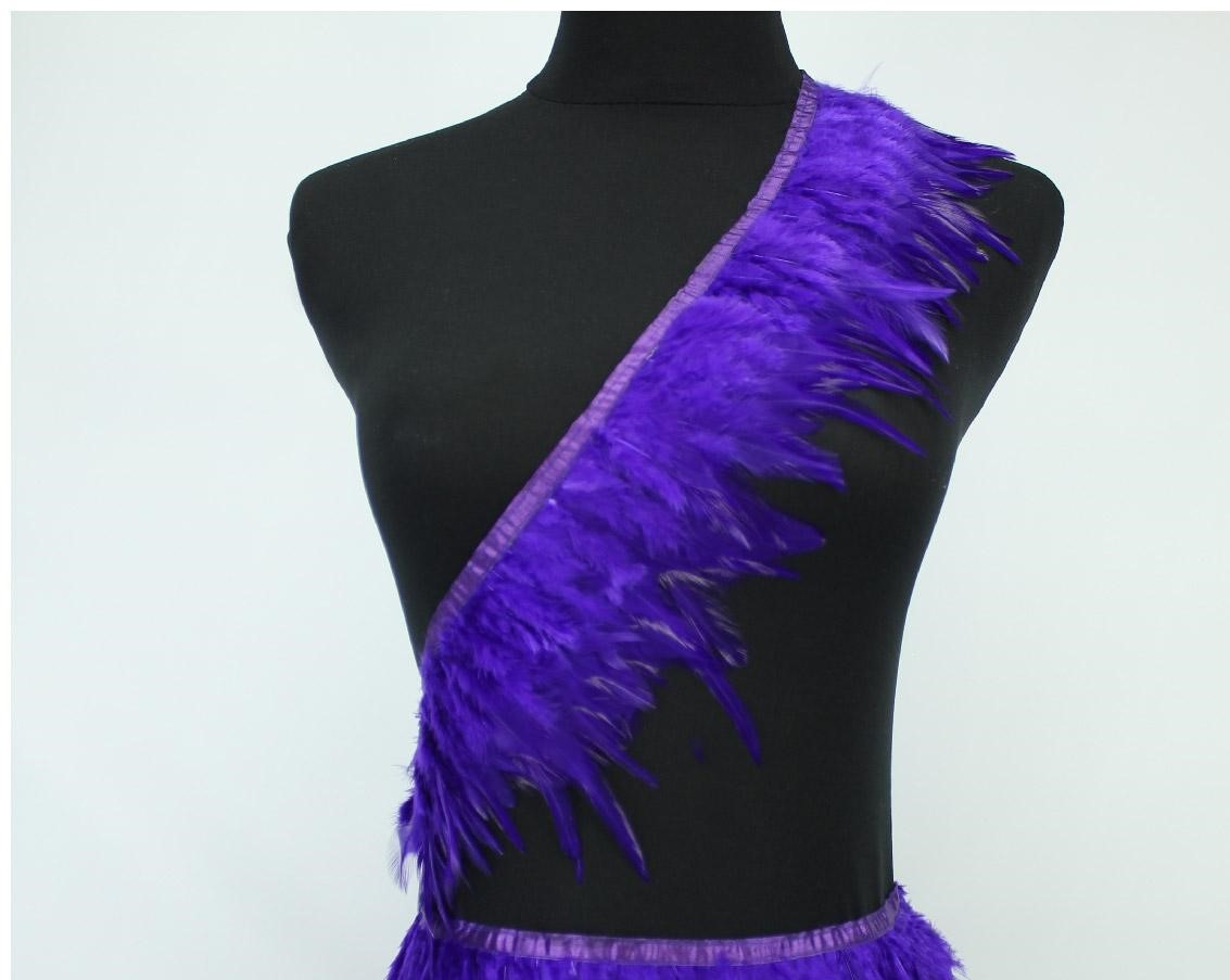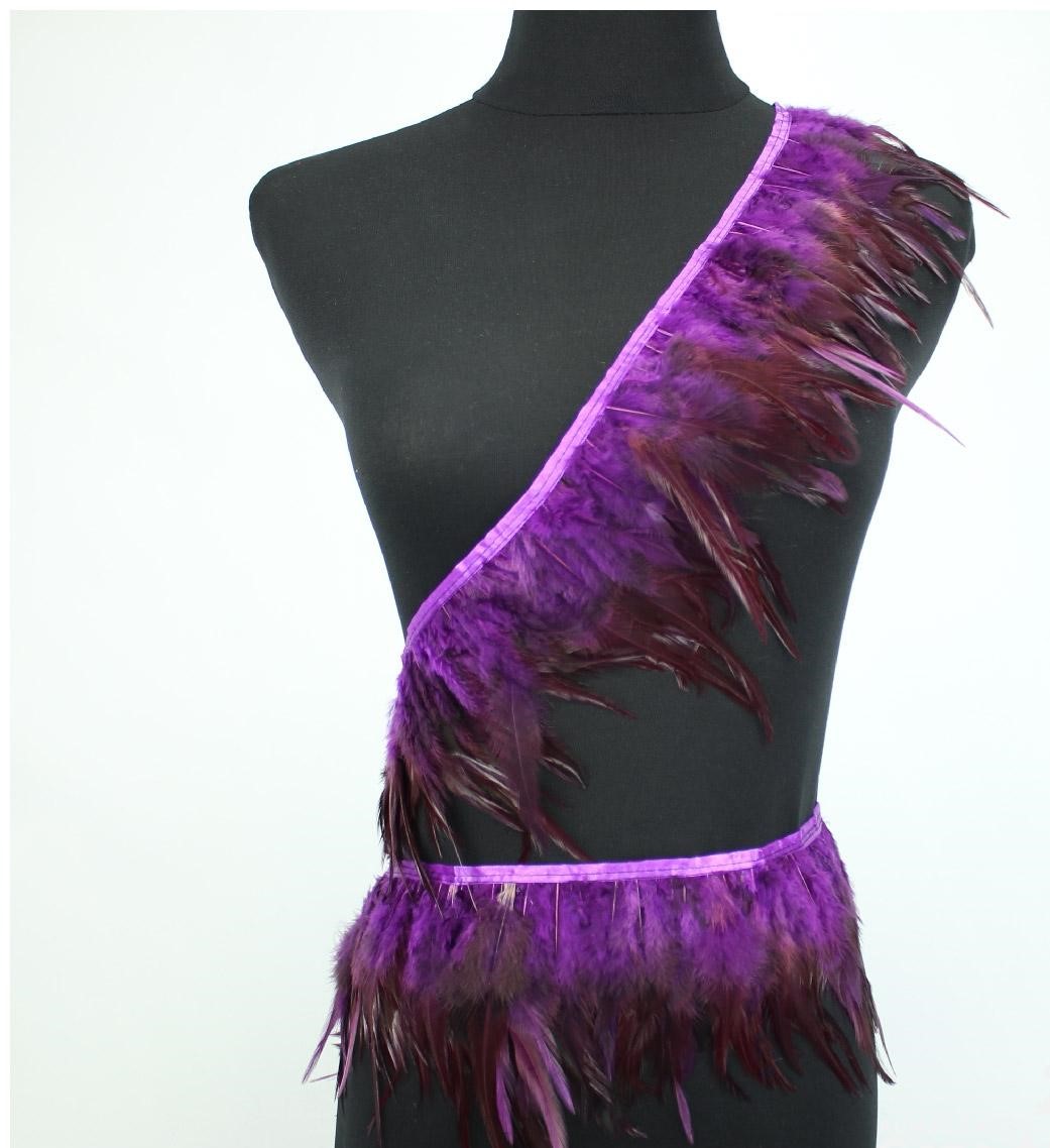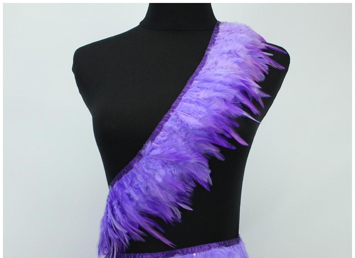 Fita decorativa com penas roxas e lilás numa manequim preta