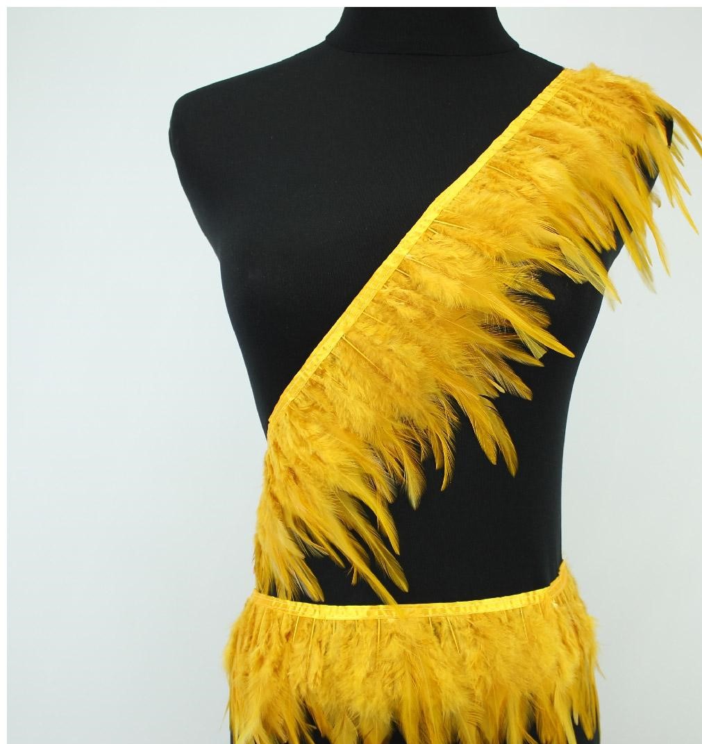 Faixa amarela com penas em diagonal sobre manequim preto